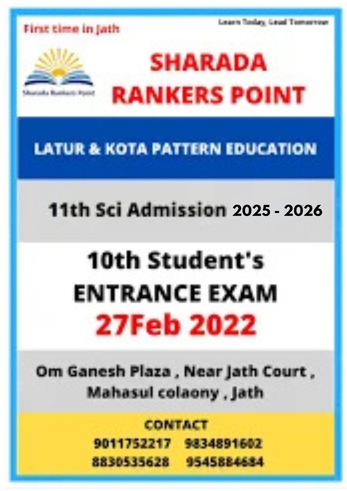 Sharada Rankers Point is one of the leading educational institutes in Jath, dedicated to nurturing future achievers. We specialize in providing result-oriented coaching for school academics, scholarship exams, and competitive entrance tests.